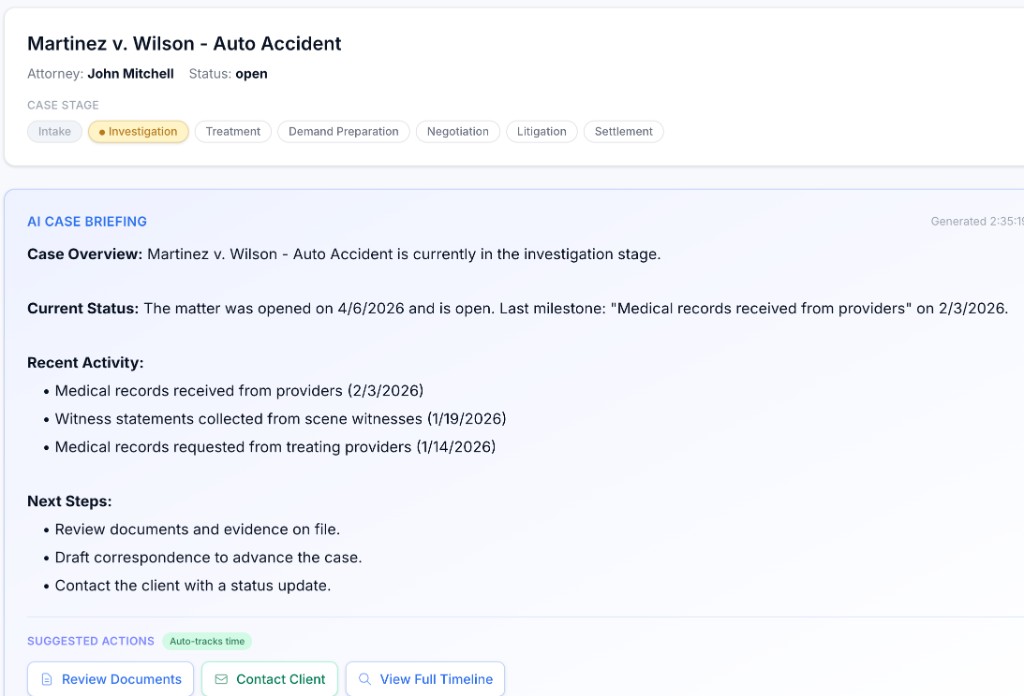 Track insurance policies, medical records, case valuations, negotiation pipelines, and deadline chains. Every aspect of PI case management in one view.